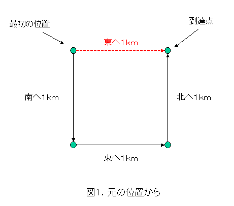 大概の人は、図1を描き、最初の位置から東に1kmの地点だと答えるでしょう。