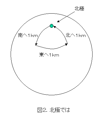 地球が丸いというなら、当然、考えは極地付近にも及ぶはずです。例えば北極を考えてみましょう。北極から、南へ1km進み、次に東へ1km進んで、最後に北へ1km進むと北極へ戻ってきてしまいますね。つまり、最初の位置から東に1kmにはなりません。