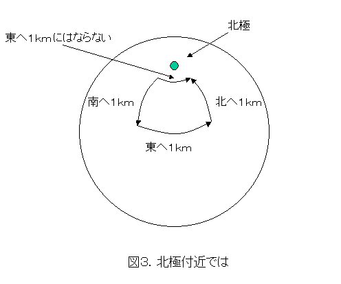 北極でなくとも、北極の近くで考えても、図3のようになり、やはり、最初の位置から東に1kmにはならないことが解かります。