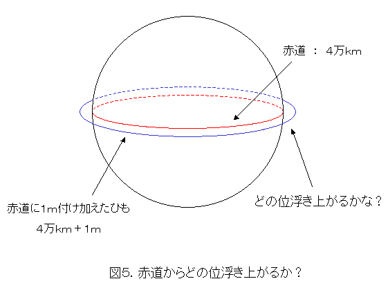 では、赤道に紐(ひも)を巻きつけ、その紐に1m継ぎ足したら、4万km+1mのひもは赤道からどの位浮き上がるでしょうか。「4万kmに1m位足したって、ほとんど変らないから浮き上がらない」という回答が多いようです。さて、みなさんの回答はどうでしょうか。