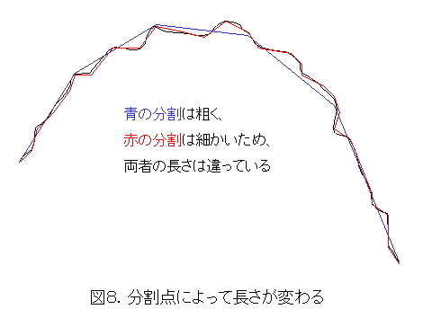 海岸線の長さを測るときには、まず海岸線を分割して測ります。道路工事の前にやっている測量を思い出すと解かりやすいでしょう。図8の青線のように分割が荒いと、長さは短めに出ますし、赤線のように分割が細かいと、長さは長めに出ます。