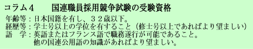上述のアソシエートエクスパート/ジュニアープロフェショナルオフィサーが外務省主催であるのに対して、この場合はUNが担当者である。受験資格は【コラム4】のとおりである。