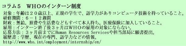 国連機関には大学生や大学院生などを対象としたインターンシップのプログラムがある。例えば、WHOだと最低6週間、最高12週間のプログラムだ。いつでも応募できる。給与は出ないので、出国から帰国まですべて自分持ちである。【コラム5】