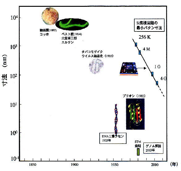 さてここで、ちょっと面白いグラフを見てみましょう。図2のグラフは縦軸が寸法で横軸がその病原体や計測技術あるいは大発見が行われた年代となっています。同時に20世紀後半にナノテクノロジーの発展に直接寄与した半導体素子の微細化の進展をプロットしてあります。