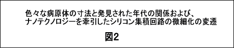 もう一つ図2の表は発見される病原体の年代に対する勾配がナノテクノロジーの微細化限界の勾配と良く合っていることです。これは人類が病気との闘いにおいて、自分たちの利用できる極限の技術をいつの時代も駆使して必死に格闘していることを意味しています。