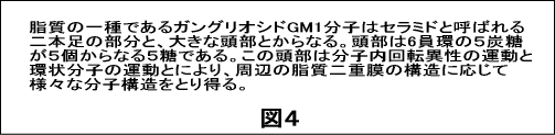 実際、ガングリオシドGM1の分子構造を調べますと、図4のように中央でおれまがりやすい構造をしています。即ち周辺のほかの脂質分子との混ざり具合がことなってガングリオシドGM1がベータアミロイドを凝集させやすい構造に変化するのではないかと言うことが考えられるわけです。
