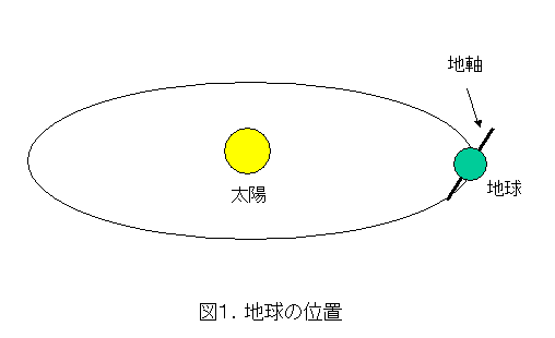 図1は地球が太陽の周りを回っている図です。地球は、太陽の周りを365日で一周していますので、1月1日を基準として、何月何日にどの位置にあるかが解かります。これは、予測が簡単ですので、自分で色々な月日の位置を計算してみるとよいでしょう。
