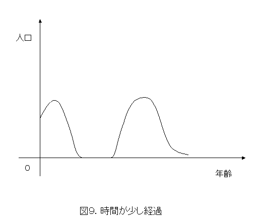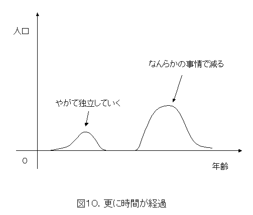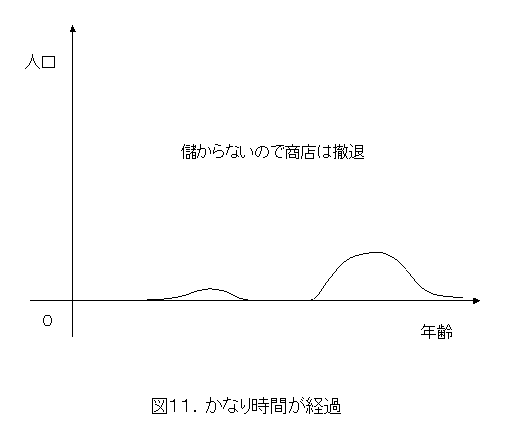 少し時間が経過したとします。人間は降って沸いたりしませんから、突如どっかから発生したということはありません。ローンを抱えているから、人の入れ替えもあまりないと考えて、図9のようなフタコブラクダ状の人口分布になっていきます。商店もそれに合わせて品揃えを変えていくことでしょう。(以上が作業仮説3)