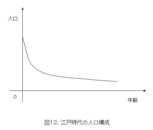 大人は突然発生しないことと、子供の死亡率が高かったことから人口構成を推定すると図12のようになっていたと思います。この構成は優れていて、色々な年代の人がバランス良く混ざっています。それはそれとして、不思議なことに時間が経っても変化しません。普通なら、人口構成が変化してゴーストタウン化する余地はあります。しかし、実際にはそうなっていません。