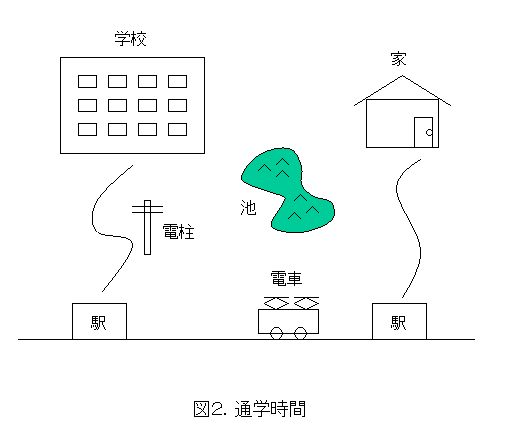 今度は、朝学校へ行くことを考えてみましょう。個人の事情で通学経路は色々あると思いますが、図2にあるような通学経路だとしてみます。遅刻しないで学校へ行くには、学校が始まる時間がおおもとになります。間に合うには、家から駅までの時間、電車に乗っている時間(電車の発車時間と到着時間)、駅から学校までの時間を考えた上で家を出る時間を決めます。みなさんも、何時までに家を出なくてはならないから、ということで朝からあせったことがあると思います。朝、家を出る時間の制限があるから、今度は、食事や身支度(みじたく)などにかかる時間で、朝、起きる時間が決まってしまいますね。
