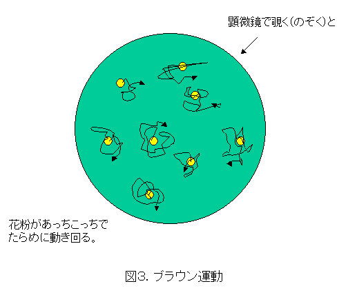 図3は、浮かべた花粉を顕微鏡で覗いて(のぞいて)いるところです。このように全くデタラメに動き回っています。ここで、花粉だと目が痒く(かゆく)なってきますので、以降は粒子ということにします。(目が痒いよー!)