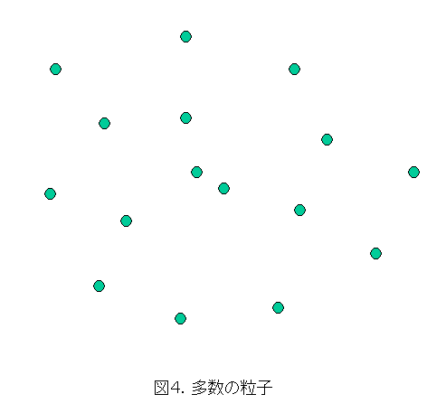 ちょっと時間には止まってもらって、多数の同じ粒子があったとします。もちろん、これらの粒子は全くデタラメな位置にあります。