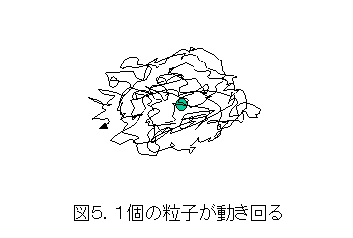 今度は、図5で、粒子の位置の時間平均を出すことを考えましょう。これは、単位時間ごとの位置を測定して足し合わせ、それをかかった時間で割ったものとして出せます(実際には、積分を使って出します)。もちろん、図5は解かりやすくするため2次元的に書いていますが、1次元的に粒子がひょこひょこと動き回っているとしても差し支えありません。