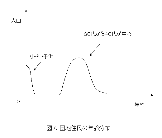 まず、出発点は団地や街、つまり建物がわんさかとできるということです。さて、それではどんな人が入ってくるのでしょうか。マンションや家を買える人は、主に30代から40代の人たちです。ローンの期間(35年ローンなんてのもあります)を考えると、支払能力から考えて、この年代の人たちが中心でしょう。年齢から考えて、小さい子供がいるかいないかというところですね。(以上が作業仮説1)