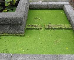 試合を終え,バスに移動する際に,部員3名がこの「石庭」を横切ろうと足を踏み入れ,ビオトープに落ちてしまったのである。この3名の生徒に聴くと,「あれが池であるとは思わなかった。落ちるまで緑色のコンクリートであることに疑いはなかった。」ということであった。今までにも浮き草をみたことはあったが,水面一面に隙間なく繁茂している状態を見たことがなかったようである。