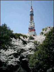 東京タワーを背景にした増上寺の ソメイヨシノ(2003年4月6日撮影) |