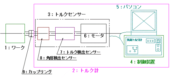 ワーク1は、トルク計2で回転駆動されます。トルク計2は、トルクセンサー3と制御装置4とソフトが内蔵されたパソコン5で構成されています。トルクセンサー3の内部には、モータ6、トルク検出センサー7および角度検出センサー8があります。