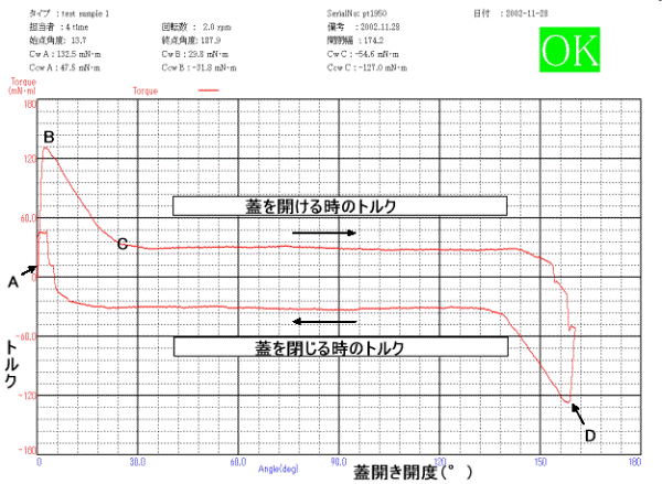 測定結果を示すグラフは、横軸に角度を、縦軸にトルクとしています。このカーブは、開閉式携帯電話を屏風のようにして、その画面が付いている蓋を開閉した時のトルクの状態を示し、人が感ずる手応えになります。