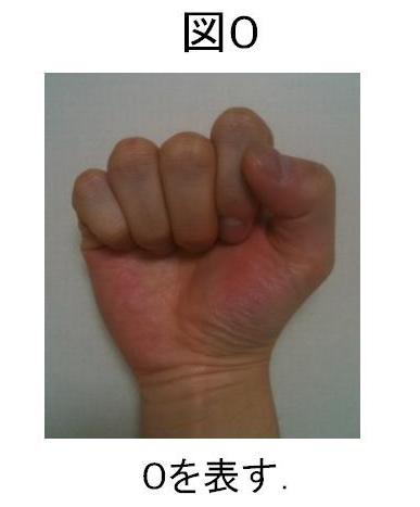 上記のルールを踏まえて、数を数えてみましょう。0は全部の指が折れている状態(じゃんけんのグーの状態)です(図0)。