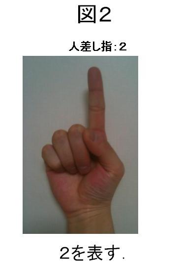 次の2は、1に1を足すわけですが、すでに親指は立っていますし、親指は2本ありませんので、次の指、すなわち人差し指を立て、親指を握ります(図2)。