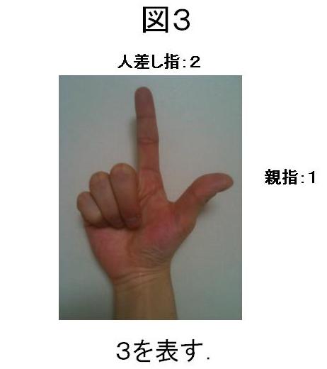 これは、普段の足し算で、1の位から10の位に繰り上がるのと同じことです。つまり、9に1を足すと、10の位が1になり、1の位が0になるのと同じわけです。3は、2(人差し指)に1を足すので、人差し指と親指が立った状態です(図3)。