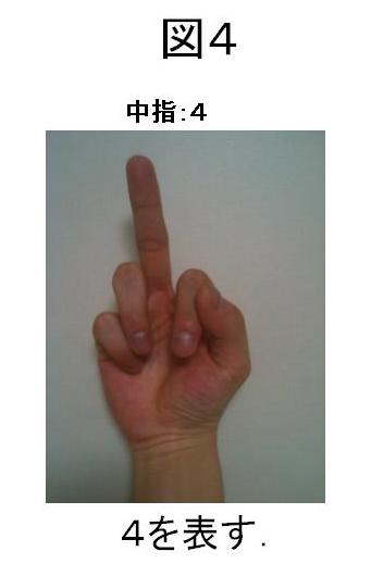 4は、3(人差し指+親指)に1を足すのですが、親指はすでに立っていますし、人差し指も立っているので、上記の繰り上がりの要領で、次の指(中指)を立てて、人差し指と親指を閉じます(図4)。