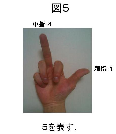 次の5にするには、親指の分の1を足せばよいので、中指と親指が立った状態(図5)になります。