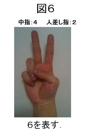 6にするには、5(中指+親指)に1を足すのですが、親指が立っているので、繰り上がって人差し指が立ち、親指を閉じます(図6)。