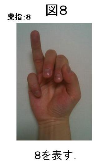 8は、7(中指+人差し指+親指)に1を足すのですが、親指、人差し指、中指が立っているので、その先の指(薬指)に繰り上げます(図8)。