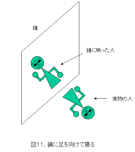 図11は鏡に足を向けて横になった状況です。鏡が前後の向き(人の向いている方向)を反転(はんてん)するということがよく解ります。しかし、この場合でも右手と左手が入れ替わっているように見えます。また、このような場合の応用として、鏡を床に置いたり、天井に貼り付けたりして眺めると(もっと簡単に、手で鏡を自分の頭の上に持っていって眺める)、上下が入れ替わっているように見え、その代わりに人の前後の向きが入れ替わっているようには見えません。これは上下を鏡の奥行き方向へ持っていったため、上下と前後そのものが入れ替わったためです。やはりここでも、鏡の面を元に考えているのではなく、人を中心に考えています。