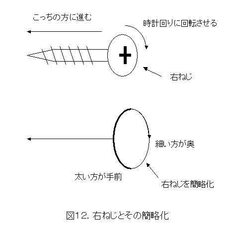 ねじを考えてみましょう。ねじは、みぞの刻まれた円形の部分(大抵は+か−のみぞ)を回すと進みます。図12は「右ねじ」と呼ばれているもので、時計回りに回すと、図の矢印の方向に進みます。これとは逆に反時計回りに回すと進むものもあり、そちらは「左ねじ」と呼ばれています。