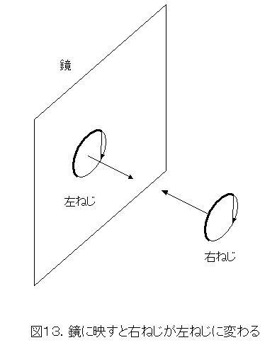 「右ねじ」を鏡に映すと図13のように、「左ねじ」になります。今までは「・・・のように見える」というものばかりでしたが、ここで初めて本当に右と左が逆になっているものが出てきました。右と左の意味に少々疑問は残りますが、ねじという物体ではなく、それを概念化したものについて入れ替わっている点が重要です。(つまり理論的ということ)