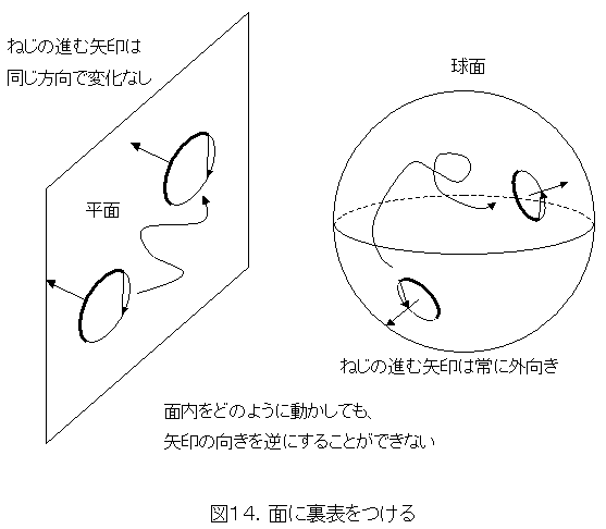 この事実を利用して、面に裏表を付けることができます。右ねじの皿を面に密着させてどのように動かしても、決してねじの進む向きを示す矢印を逆向きにすることができないときに、その右ねじの進む向きの方を「表」反対側を「裏」とすればよいことになります。(図14で矢印のある側が表、ない側が裏です)