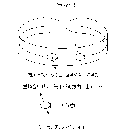 メビウスの帯は裏表のないことで有名です。メビウスの帯で、右ねじの皿を面に密着させて一周すると、図15のようにねじの進む向きを示す矢印が反対向きになります(面に厚みがないことに注意しましょう。実際に紙で作るときは厚みがありますので、一周してもとの位置というのは紙を透かしてみなければなりません)。確かに、ねじの進む向きを示す矢印が逆向きになっていますね。