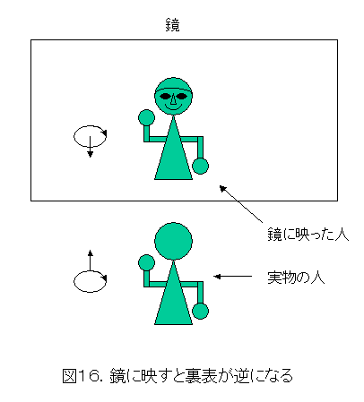 前に書いたように、鏡に映すと、右ねじが左ねじに入れ替わりますので、図14の手前で書いたことから、「鏡に映すと裏表が入れ替わる」ということが解ります。