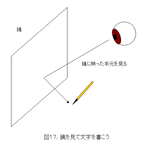 鏡は我々の視覚(しかく)と運動機能の関係を乱します。これは、簡単な実験で確かめられます。目の前に鏡を置いて手元が映るようにします。そして、鏡に映った手元を見ながら文字を書いてみてください。まず、まともに文字なんか書けません。文字でなくとも四角形など、もっと簡単なものでも書けません。むしろ目をつぶってしまった方がきちんとかけるでしょう。