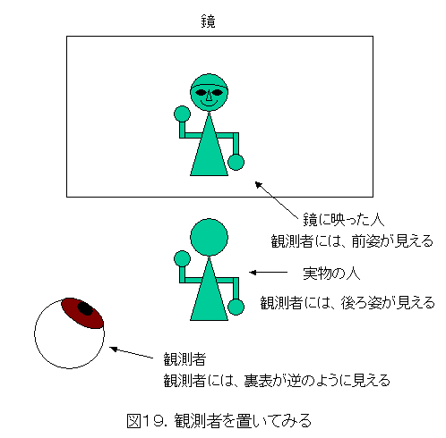 図19はあえて第3の観測者(かんそくしゃ)を置いたものです。この観測者から見れば、左右が逆ではなく、裏表が逆になっているように見えます。図19をよく見てください。観測者には、実物の人の後ろ姿しか見えません。鏡に映った姿は、前から見た姿として見えます。従って、観測者には裏表を入れ替えたものとして見えます。