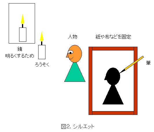 シルエットの作り方は図2にある通りです。ろうそくの光(鏡を利用して明るさを増します)を利用し、その人の特徴が最も出るような影が作られ、その影の輪郭(りんかく)に沿って筆で描いて、切り抜かれ、最後に白い紙にのり付けされます。こうして作られたシルエットは、おどろくほど実物とよく似ていることがあります。しかも、かなり安くあがります。