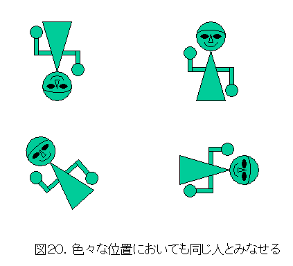 我々の脳がどのような機構で判定しているのかは解りません。ですが、かなり優秀な判定機構を持っているものと思われます。図20のように同じ人を色々な方向に向けても同一と判定します。更に、空間内を色々動かしてできるものは同じものと判定できます。そればかりか、多少変形を加えても、やはり同一と判定したりします。知り合いが太ったり、やせたりしてもやはり同じ人と判定していますよね。