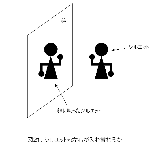 今までの考察から、シルエットを鏡に映しても、上下左右全く変わりません。こう書くと、すぐに図21のようなものを考えて反論する人がいます。鏡が前後方向を逆にするということをうまく利用しています。つまり、鏡の面に対する左右を前後に入れ替えて、前後が逆になっていることを左右が逆になっていると読み替えています。我々の脳が主体を鏡ではなく、シルエットの方にとって判定しているということがよく解りますね。やはり、左右が逆に見えるというのは、脳の判定機構の問題のようです。