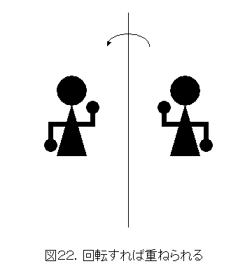 なお、シルエットは輪郭情報だけですので面ではありません。便宜上(べんぎじょう)黒く塗ってあるだけです。輪郭情報だけということは、シルエットの人がどっちを向いているのかが解らないということです。つまり、上げている方の手が右手なのか左手なのかが解りません。また、図22のように軸の回りの回転によって重ね合わせることができます。重ね合わせられるということから、同じものと考えられるはずです(図20の説明)。しかし、それでも左右が逆になっているように見えます。いったい、脳はどのように判定しているのでしょうか。全く解りません。