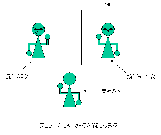 図23は、ごく普通に左右が逆になっているように見える状況の判定を考えてみたものです(視点は図中の実物の人)。我々は脳の中に自分の姿を持っていますので(美化されていたりしますが)、それを書き加えてあります。今までの考察で、状況にもよりますが、シルエットを鏡に映しても、上下左右全く変わりません。変わるのは裏表が入れ替わるだけです。そして、裏表が入れ替わっているため、空間内でどのように動かしても、脳の中にある自分の姿とは重なり合いません。恐らく、鏡に映った自分と一番近いものは、図23の「脳にある姿」として描いた状況だと思います。(どのように、何がもっとも近いかという判定をしているのかも解りません)