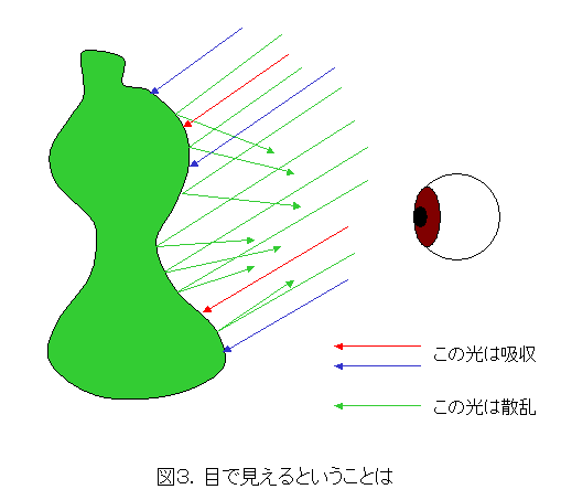 少し難しくなりますが、光には波長というものがあって、特定の波長の光を反射し、その他の波長の光を吸収すると、我々の脳はその反射された光の波長を目で捉えて色を付けます。図3のひょうたんみたいなものの色と光線の色を見て考えてください。なお、光の波長と色については「第37話 光や音の話」に説明がありますので、興味のある方はご覧ください。