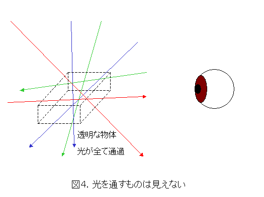 図4にあるように物体があってもなくても目に入ってくる光は同じです。ということは、その物体があるかないかは目を通して判定できないことになります。つまり見えません。透明ということですね。(半透明については自分で考えましょう)