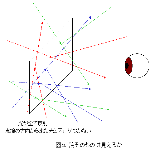 どうして鏡そのものを見ることができないのでしょうか。図5を見てみると、鏡で光がきれいに反射されてしまうということは、鏡の奥の方から、点線で書いた矢印のように光がきているのと同じになります。その光は、あたかも何事もなかったかのように、そのまま実線で書いた矢印のように進みます。つまり、鏡なんかないも同然のように振舞(ふるま)われるわけです。ないものは見えませんから、鏡そのものは見えないということになります。