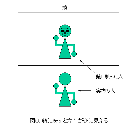 図6をよく見てみましょう。確かに、実物の人が左手を上げているのに、鏡に映った人は右手を上げていて、左右が逆になっているように見えます。その他に何か気づきませんか。