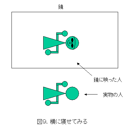 図9は横を向いている状況です。この際に、全体を見ると、上下も左右も入れ替わったようには見えません。しかし、人を見ると右手と左手が入れ替わったように見えます。実物の人から見れば、上が左で、下が右です。それでも、鏡に映った人は、上が右で、下が左で、上下は入れ替わらず、左右だけ入れ替わっているように見えます。なにか矛盾した状況のような感じですね。どうやら鏡の面を元に考えているのではなく、人を中心に考えているようです。