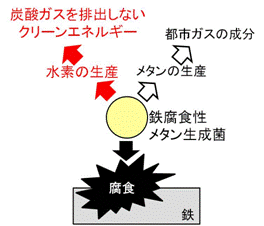 困った側面:鉄に対する腐食作用(黒矢印)。有用な側面:クリーンエネルギーとなる水素の生産(赤矢印)、都市ガスに含まれるメタンガスの生産(白矢印)。