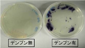 左:デンプン無しとデンプン有りで培養したプレート。“デンプン有”のみにヨウ素−デンプン複合体の紫の着色が観察できます。
