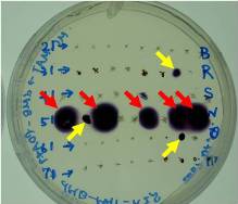右:色々な微生物をデンプン有りで培養したプレート。黄色矢印で示したコロニーは、コロニー自身が紫に着色、赤色矢印で示したコロニーは紫の着色がコロニーの周りに広がっています。